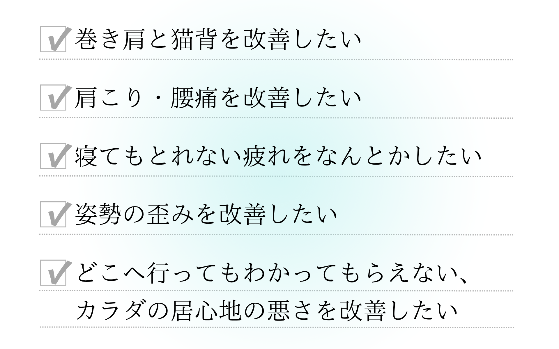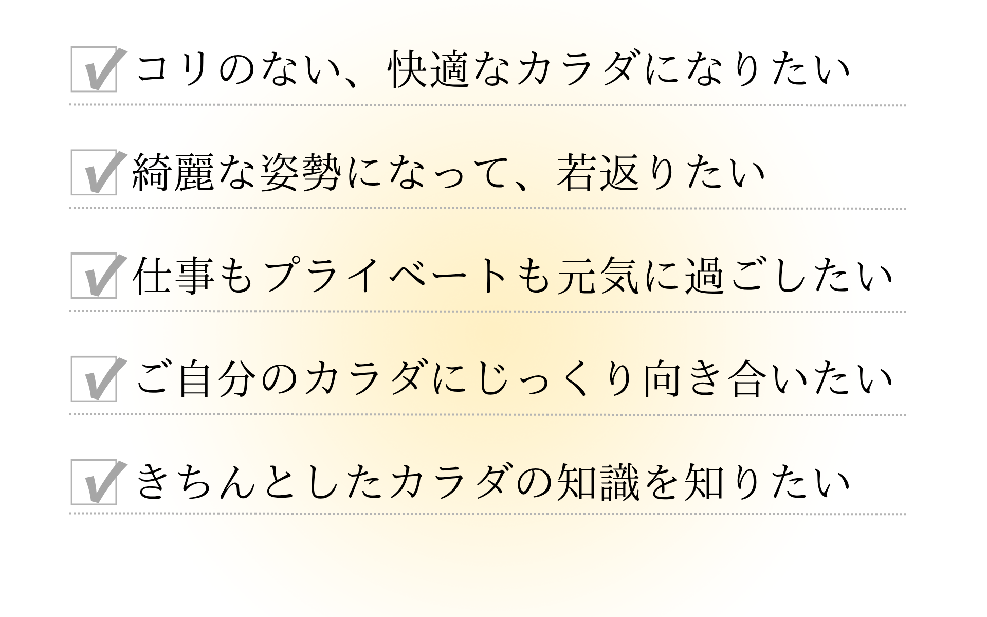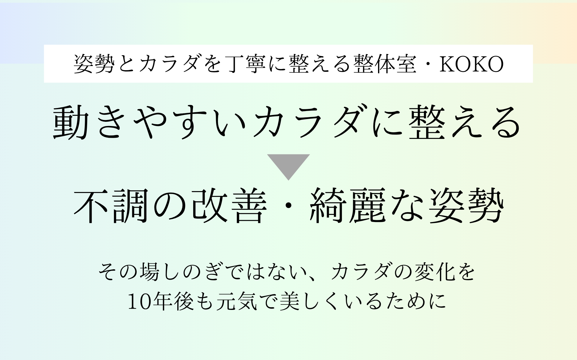 ホームページをご覧頂きありがとうございます。整体室・KOKOは専門知識・技術を持つ施術者が運営している整体室です。全身の筋膜を整えて、姿勢を整えるRolfing®と、その方の状態に合わせた“オーダーメイド整体”を提供しています。医療の現場で培った知識・技術に基づきながら、様々な手技療法、日本の古式療法を用いて、皆様のお悩みを改善する施術を全力で提供致します。